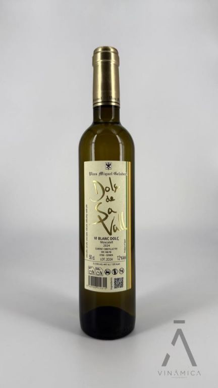 Dolç de Sa Vall es un vino blanco dulce elaborado con una cuidadosa selección de uvas sobremaduradas de Muscat (Moscatel de grano menudo y Moscatel de Alejandría), cultivadas en viñedos de Manacor, dentro de la D.O.P. Pla i Llevant. La fermentación se realiza en depósitos de acero inoxidable a temperatura controlada, sin pasar por crianza en madera, lo que permite conservar su carácter fresco y puro. Su color es amarillo pajizo, limpio y denso; en nariz destaca por su intensidad aromática, con notas florales y frutas frescas, especialmente de la propia uva; en boca es fresco, con cuerpo, largo y muy bien equilibrado gracias a la armonía entre acidez y dulzor. Ideal para acompañar foie gras, aperitivos o como vino de media tarde servido entre 5 °C y 7 °C