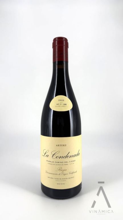 El Artuke La Condenada es una de las referencias más destacadas de Bodegas Artuke, una bodega familiar ubicada en Baños de Ebro, en la Rioja Alavesa. Este vino se elabora con uvas de una única parcela plantada en 1950, situada a 660?m de altitud sobre suelos arcillo-calcáreos. La viticultura se basa en prácticas sostenibles y una estricta selección de las mejores uvas, lo que da lugar a una producción limitada de aproximadamente 900 botellas por añada.La vinificación se realiza con una meticulosa selección en el viñedo, cepa, racimo y grano a grano. Tras una vendimia manual, las uvas se fermentan en pequeños depósitos de acero inoxidable, donde se realiza un pigeage diario. Posteriormente, el vino se cría durante 12 a 16 meses en barricas nuevas de roble francés de 500?L, donde realiza la fermentación maloláctica espontáneamente.El resultado es un vino de gran complejidad y elegancia, con una paleta aromática que combina notas de frutas negras maduras, flores silvestres, especias dulces y un toque mineral característico del terroir de Rioja Alavesa. En boca, se presenta con taninos finos y una acidez equilibrada, que le confiere una excelente capacidad de guarda. Este vino refleja el compromiso de Bodegas Artuke con la calidad y la autenticidad, buscando siempre expresar el carácter del terruño de una forma única y precisa.